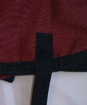 The pack you have to buy to make this is good in that it’s made to stand up to some use plus it comes in a variety of colors! At TSC it comes in black, burgundy, hunter green and navy. I’ve seen (at other stores) bright red, hunter green and royal blue. Makes for stylin’ pooches. The paniers close via velcroed flaps for easy access of gear (warning: stuff can fall out easily if over loaded). The packs also have tiny D-rings on the underside for securing items such as water bottles when on your horse. I used to keep them on for the belly strap, but have since revised the pattern to removing the rings entirely. You can leave them on, if you like, for whatever reason. It’s your pack.