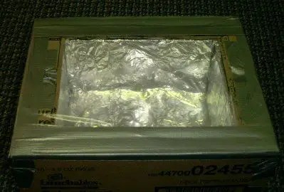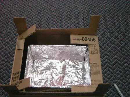 Cut the flaps off the top of the small box. Line with aluminum foil, making sure to cover all surfaces. You might want to secure it with clear tape, but it’s not necessary.