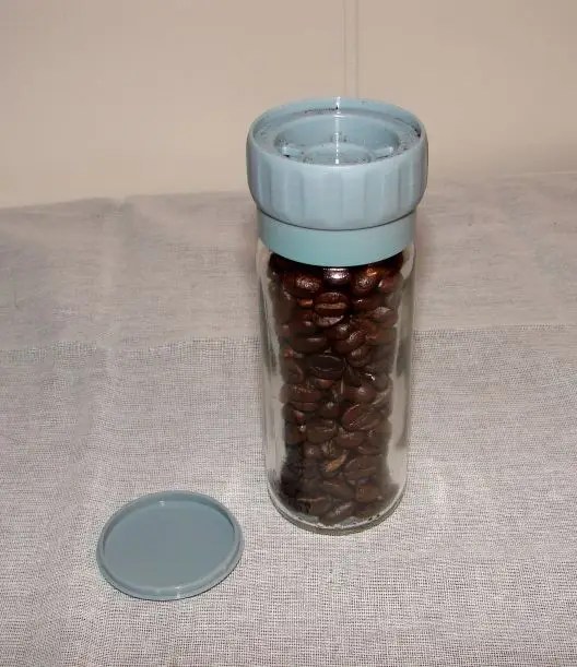 It weighs 5 ounces (142 g) with 4 ounces (113 g) of that being the small glass jar. It holds 6 T. (89 ml) of coffee beans; about enough for one pot of French pressed coffee.
