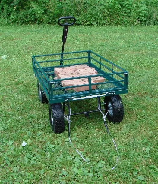 This cart has a 1200# capacity (I don’t know the weight of the cart itself, but it’s over 50#). I used 1400# test vinyl-coated metal rope for the traces. I clip him in using a screw-gate carabiner. I tied down the steering mechanism, but am still having some trouble keeping it from moving around, so it sometimes doesn’t track very straight. If anyone has any suggestions on how to improve that, please let me know in the comments section.